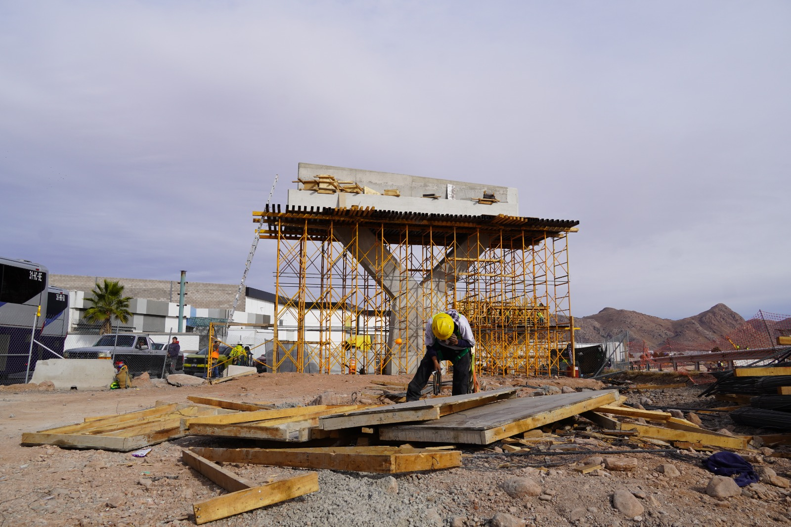 Actualmente, los trabajos consisten en el cimbrado y colado de las columnas que sostendrán la estructura, así como en la continuidad de las labores en los muros de tierra armada para la conformación de las rampas correspondientes.