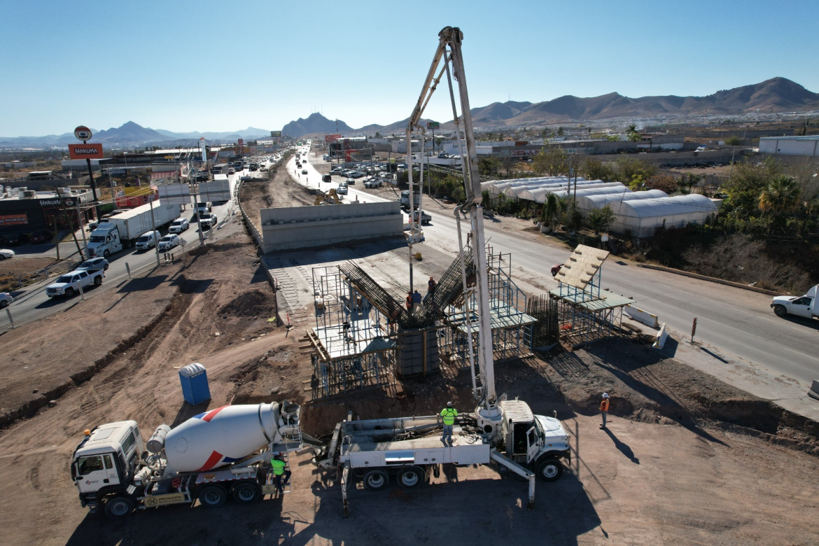 El Gobierno Municipal, por conducto de la Dirección de Obras Públicas, mantiene los trabajos de construcción del Paso Superior en el cruce de la carretera Chihuahua–Aldama y la avenida Fuerza Aérea, obra que actualmente registra un avance global del 14%.