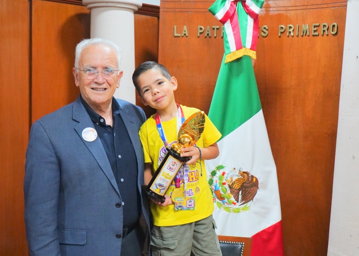 Luis, quien estudia en el Instituto Bilingüe Abraham Lincoln, arribó a la Presidencia Municipal acompañado de sus padres, portando sus medallas y el trofeo que recibió en Camboya, el 25 de julio de 2025, cuando resultó ganador.