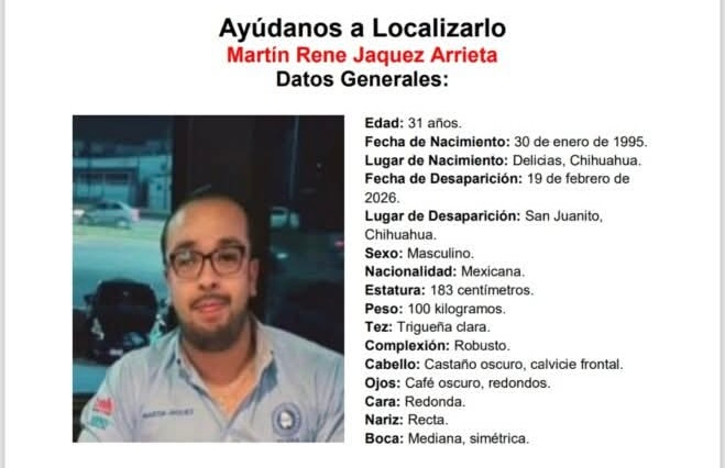 Autoridades del estado de Chihuahua solicitan el apoyo de la ciudadanía para localizar a Martín Rene Jáquez Arrieta, de 31 años de edad, quien fue visto por última vez el pasado 19 de febrero de 2026 en el hotel De La Sierra, ubicado en San Juanito, Chihuahua.