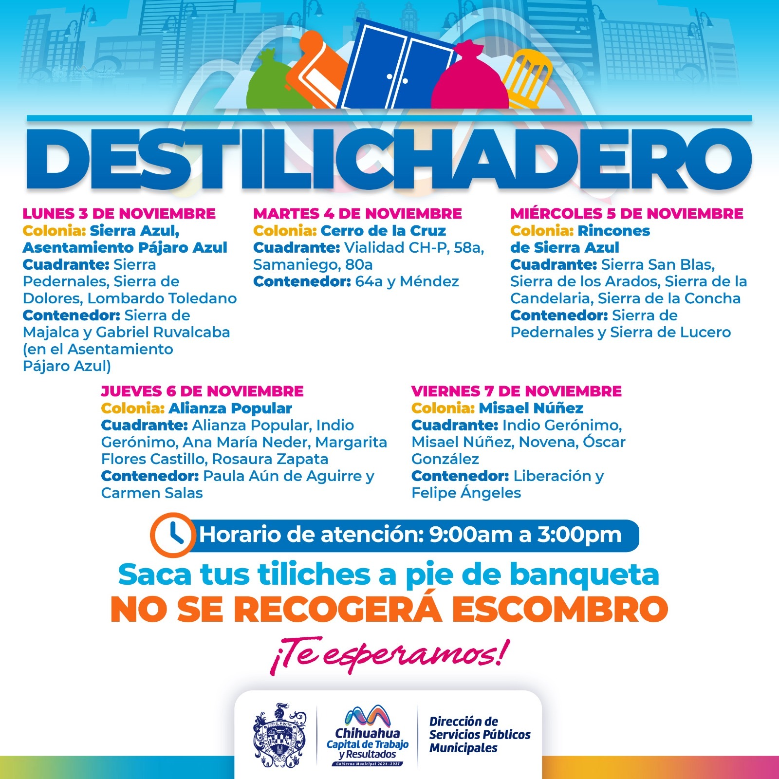 Para evitar acumulaciones de basura de grandes dimensiones en las viviendas, que podría generar plagas o problemas de salud, el Gobierno Municipal, a través de la Dirección de Servicios Públicos Municipales, informa el calendario del programa Destilichadero, que se realizará en seis de colonias de la Capital del 3 al 7 de noviembre.