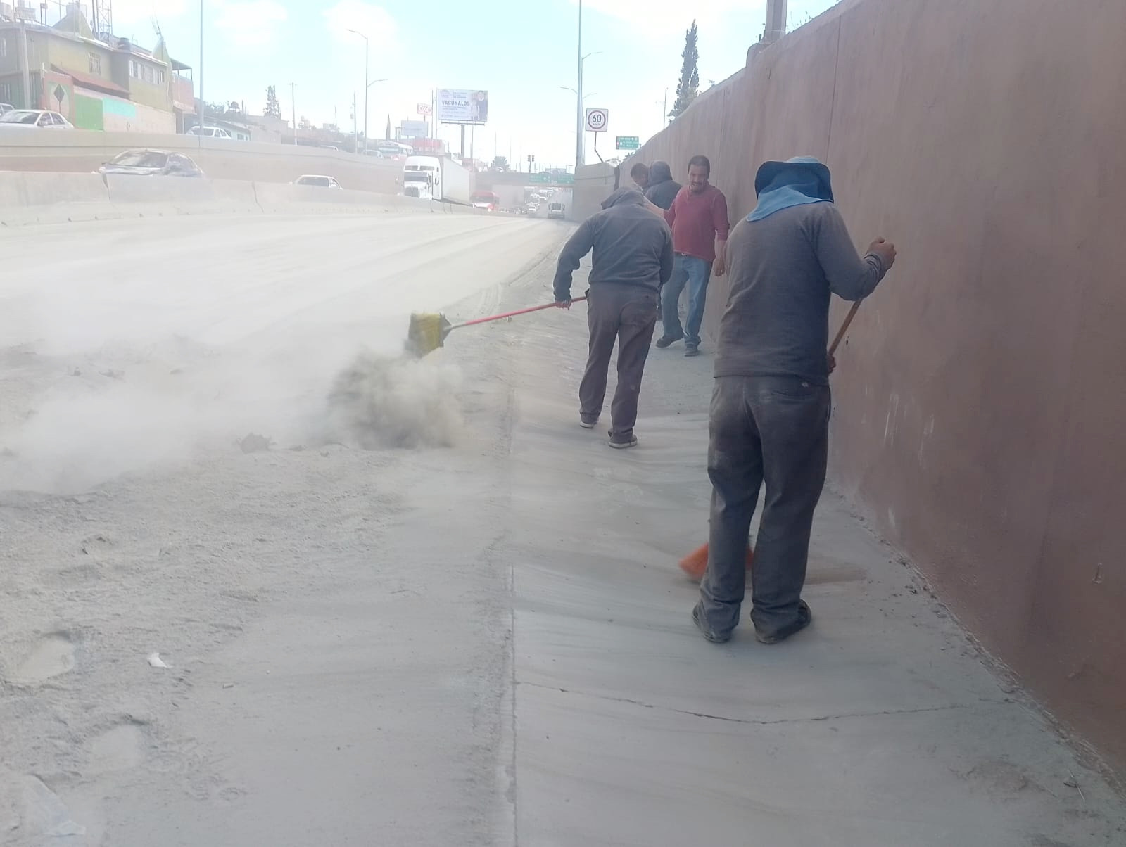 El Gobierno Municipal, a través de la Dirección de Servicios Públicos Municipales, trabaja en la limpieza del cemento que un camión tiró en el periférico de la Juventud, a la altura de la colonia Campesina.